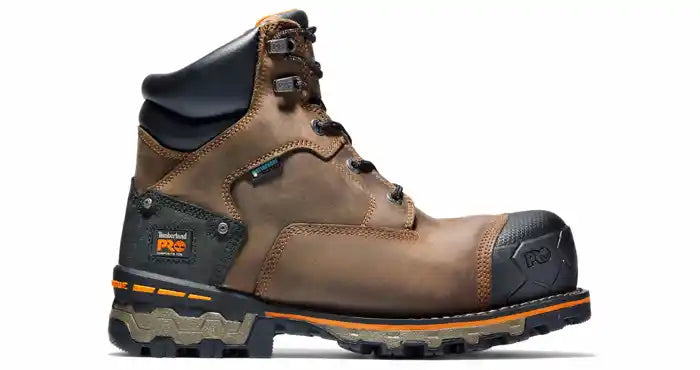 We designed our heavy-duty Boondock manufacturing boots to provide industrial-grade protection from every angle. Starting with their Premium Timberland® waterproof leather uppers with internal waterproof, breathable membranes for maximum waterproof protection and resistance to blood-borne pathogens, we added our molded Timberland PRO® rubber toe protectors that are as thick as standard boot outsoles and backed with composite safety toes, rigid external heel cups to support lateral movement, and our Anti-Fatigue Technology footbeds for all-day shock absorption and energy return. You'll also find protection from below with our heat-, slip-, oil, and abrasion-resistant, non-marking, lightweight, All-Weather TPU outsoles that offer enhanced traction in extreme environments. Plus, their breathable, moisture-wicking linings are made of ReBOTL™ fabric containing at least 50% recycled plastic with an antimicrobial treatment for odor control.